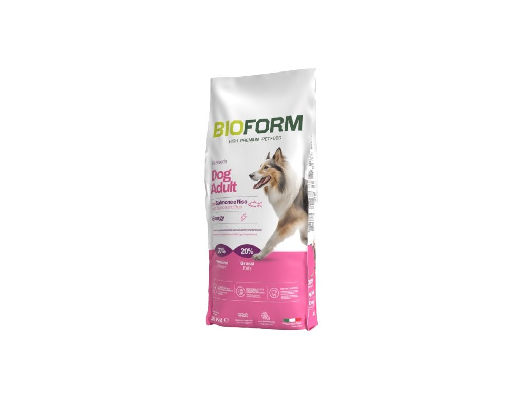 Bio Form dog adult all breeds energy s lososom a ryžou je krmivo High Premium Quality doplnené bielkovinovým hydrolyzátom čerstvých rýb, určené pre dospelých psov všetkých veľkosti, keď sa vyžaduje vysoký príjem bielkovín, ale s vyváženým príjmom lipidov.