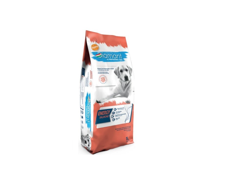 Diamant Energy s lososom je kompletné krmivo pre dospelé psy stredných/veľkých plemien. Krmivo je vhodné vo všetkých situáciach, kde je potrebný vysoký príjem s vyváženým množstvom lipidov. Vysoký obsah proteínov podporuje fyzickú vytrvalosť a uľahčuje rýchlu regeneráciu svalov. Napriek tomu Diamant Energy bol vytvorený s miernym množstvom tuku. Krmivo bolo vytvorené z vysokokvalitných surovín ako sú kura, moriak a ryža.