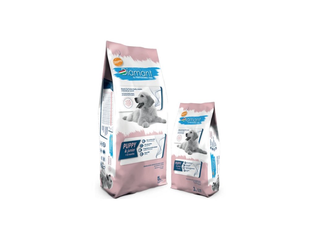 špecialistami, aby vyhovel potrebám šteniatok v najdôležitejšom období ich života. Prispieva k správnemu vývinu svalového aparátu a kostry. Technológia, ktorou sa vyrába, zaručuje ľahkú stráviteľnosť krmiva a chuť do jedla. Vhodná výživa pomáha pri vývine mozgových buniek, štruktúry kostí a svalovej hmoty. Diamant pre šteňatá a junior psy je správne krmivo pre Vaše šteňatá.