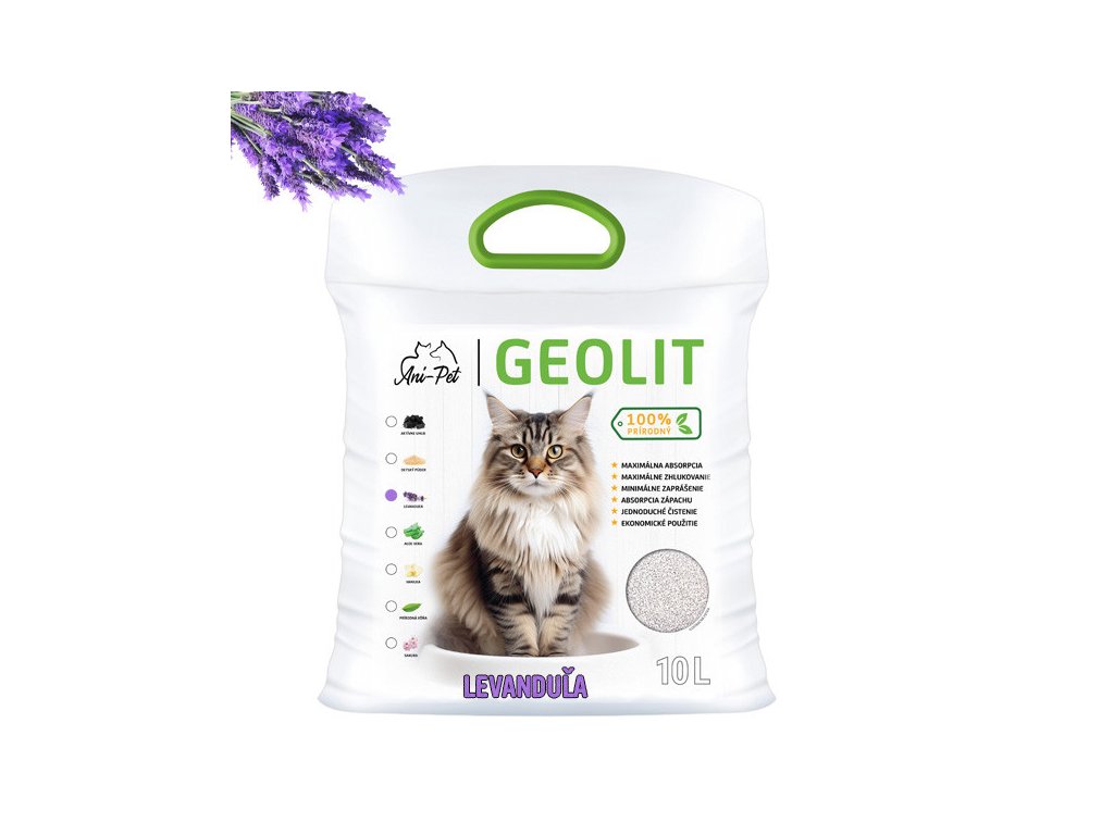 GEOLIT ultra biela bentonitová podstielka do toalety pre mačky s vôňou levandule. Prirodzene absorbuje zápach a vďaka vôni levandule udržuje okolie záchodíka v príjemnej aróme.
