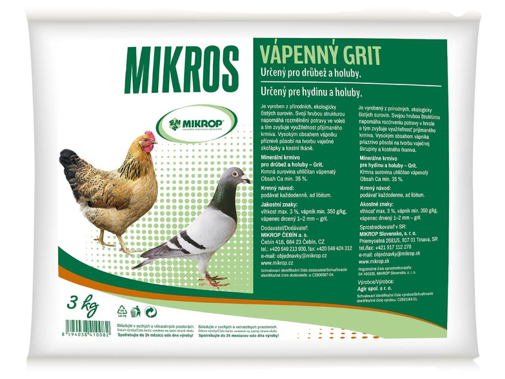 Akostné znaky: vlhkosť max. 3 %, vápnik min. 350 g/kg, vápenec drvený 1 – 2 mm – grit.